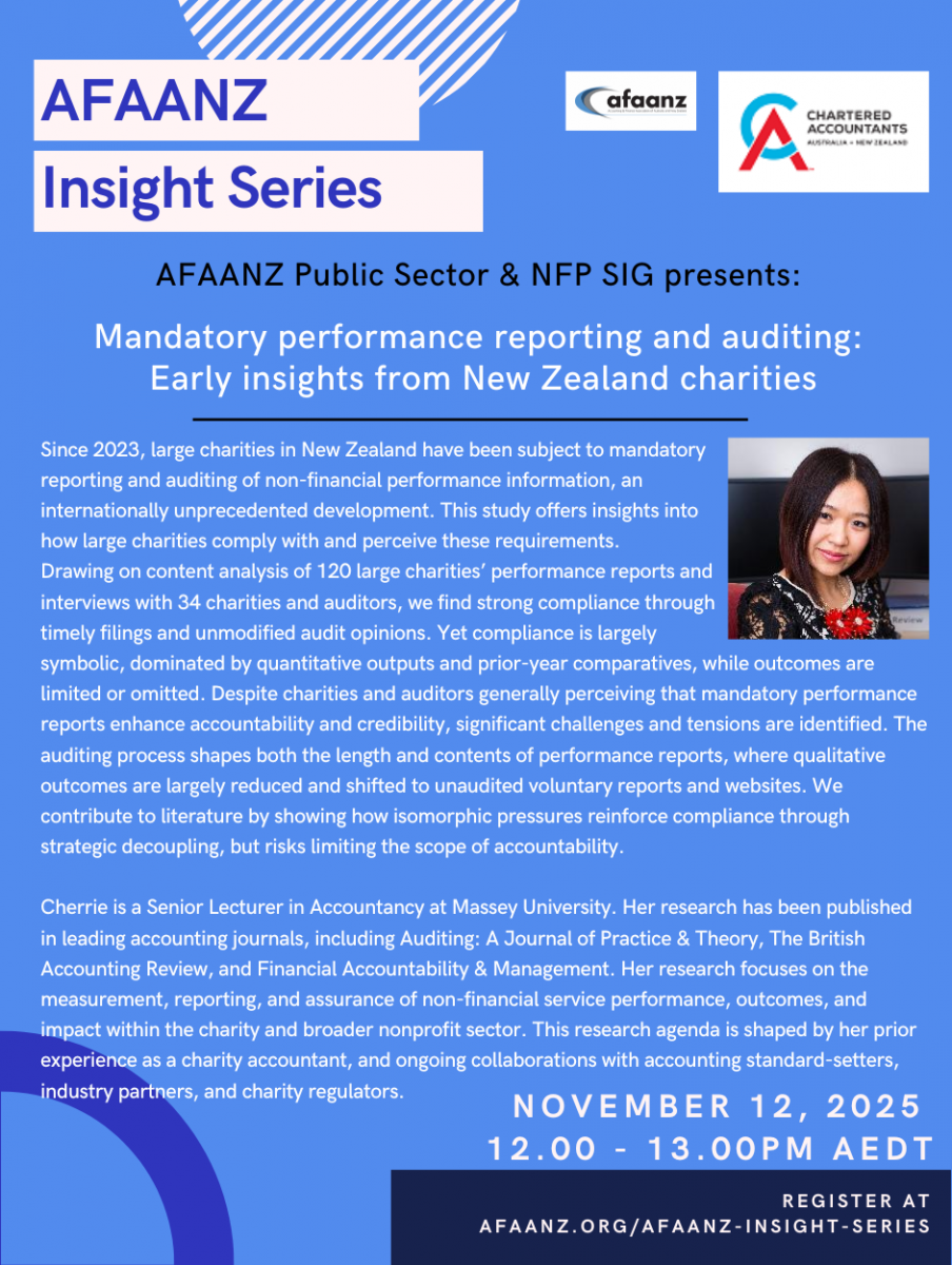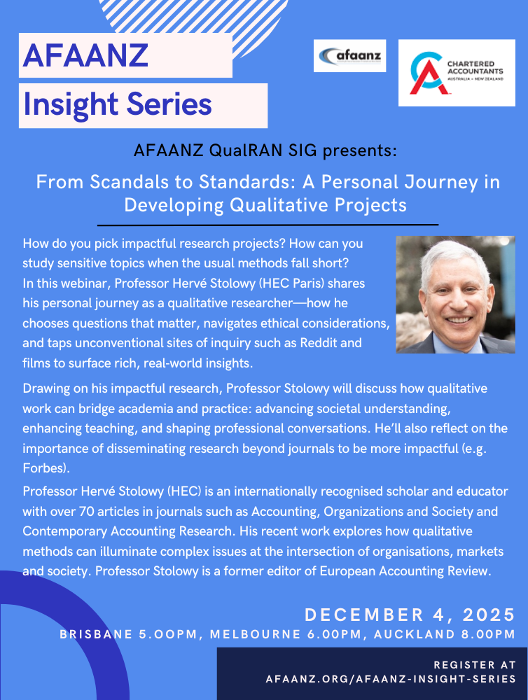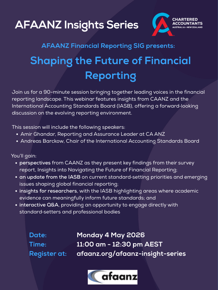 The AFAANZ Insight Series is a monthly event from February to November. The highly interactive program will be primarily virtual, providing better access to AFAANZ members across the globe. Enhance your research and teaching skills, get advice on publishing, be informed of recently introduced accounting standards, get hands-on experience of emerging pedagogical technology and connect with your colleagues across Australia, New Zealand and beyond.