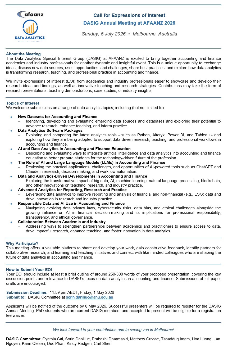 Further details will be released soon, including the call for papers welcoming research papers and extended abstracts across a broad range of accounting and finance research areas.